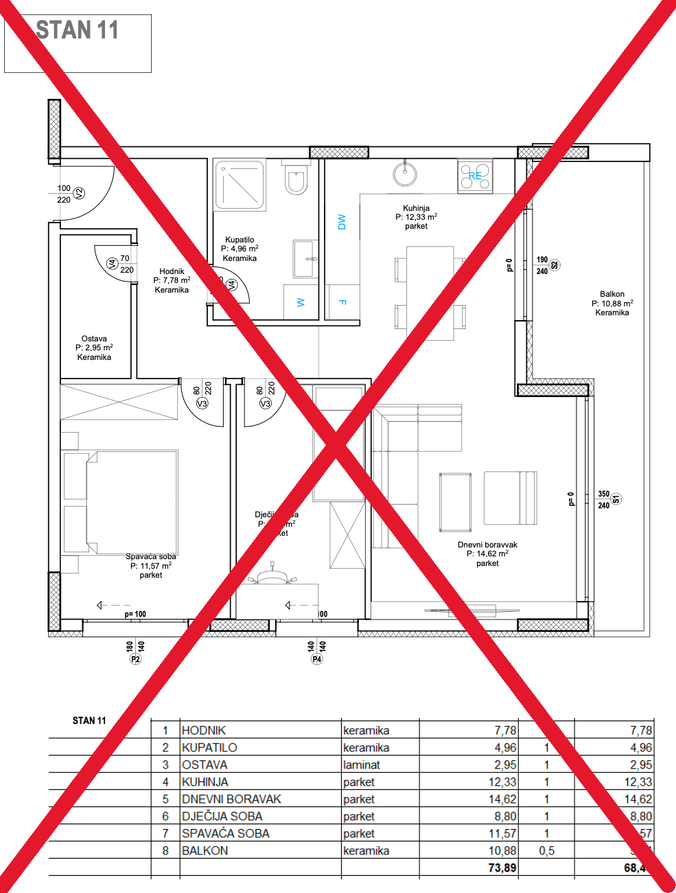 Podovi prostorija će biti obloženi kvalitetnim keramičkim pločicama italijanskog proizvođača Gres Porcellenato.